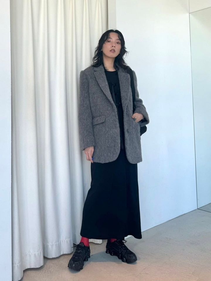 「ジャケットのシャギーと、ドレスの柔らかいカットソーの素材でメリハリのあるコーデにしました。差し色にトレンドカラーのレッドをソックスで取り入れたのもポイントです。お気に入りのメッシュベストをドレスに合わせて、シンプルながらも個性が出るスタイリングにしました」