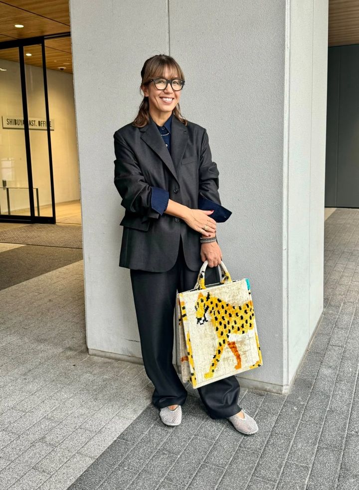 「トラディショナルなセットアップに、濃いインディゴのデニムシャツはボタンを上まで止めて、きっちりとした印象にしました。シルクヴェルベットの大きなトートバッグやメタリックシューズなど遊び心のある小物を合わせて、存在感を出しています」