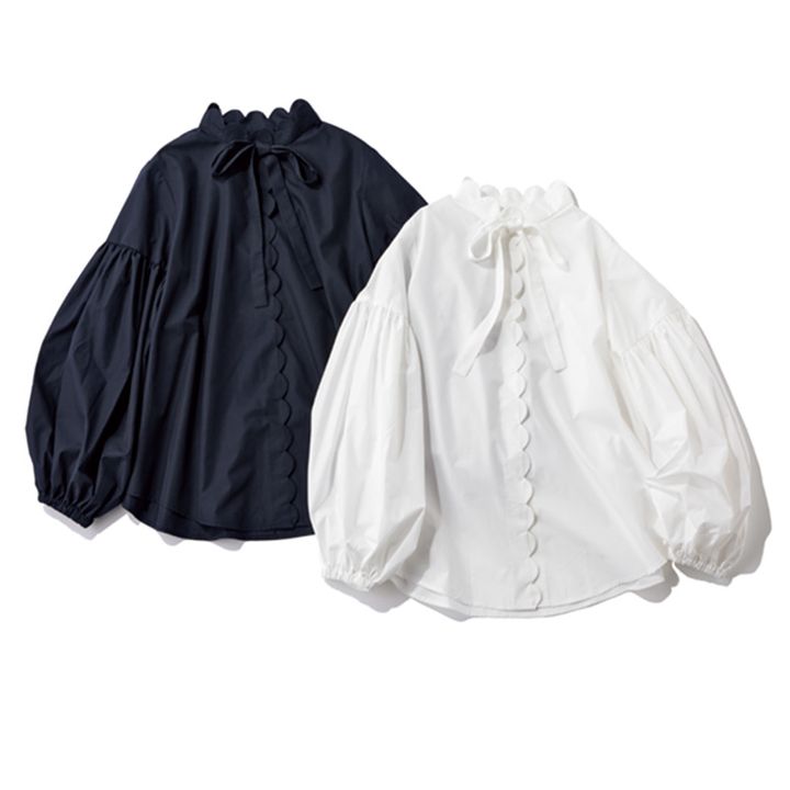衿からセンターラインにかけて繊細なスカラップデザインを施したブラウス。細身で大人っぽいリボンはボタンで取り外し可能。洗濯機洗いOK。