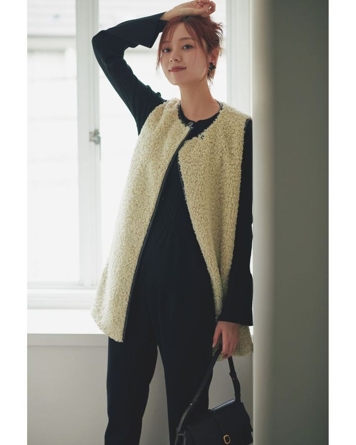 ジレ¥40,700(スリードッツ/スリードッツ表参道店)ニット¥17,600(ランバン オン ブルー/レリアン)パンツ¥17,600(SONO/ミラク)イヤリング¥28,600(セシル エ ジャンヌ/セシル エ ジャンヌ 青山店)バッグ¥38,000(ルメン/office. koizumi.)パンプス¥16,500(ダイアナ/ダイアナ 銀座本店)