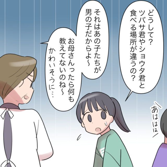 ユズキが「どうして?ツバサ君やショウタ君と食べる場所が違うの?」と聞くと、義母は「それはあの子たちが男の子だからよ~お母さんったら何も教えてないのね~かわいそうに・・・」と言いました。
