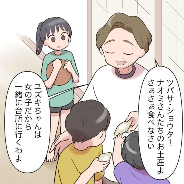 手土産に持ってきたお菓子を、義母がユズキの従兄弟たちに配りました。彼らはお菓子を貰って自由に遊んでいます。ところが義母は「ユズキちゃんは女の子だから一緒に台所に行くわよ」と言いました。