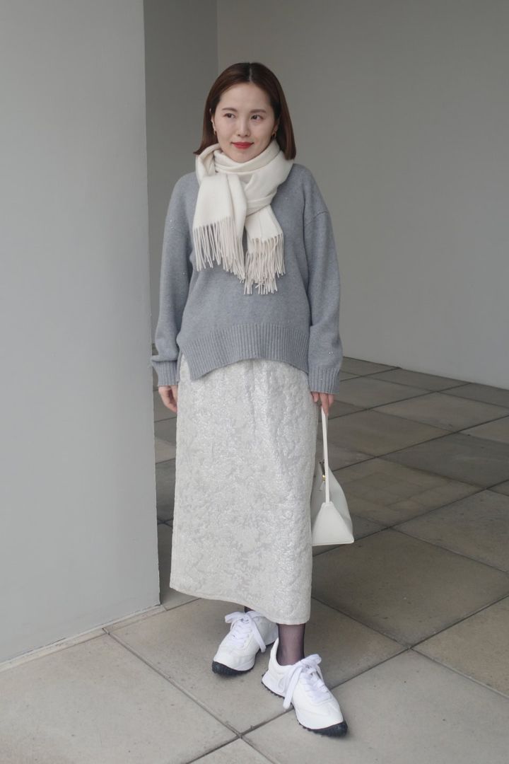 「日常的に着られるウールカシミヤのソフトな素材に、さりげなくスパンコールをあしらったニットは、シンプルすぎず、ドレッシーにもなりすぎない絶妙なムードがお気に入りです。これからのホリデーシーズンは、ちょっぴり着飾りたいけど気張りすぎない着こなしが気分なので、グロッシーながらIラインのスッキリしたスカートと合わせてみました。 足元はブーツとも悩みましたが、Maison MIHARA YASUHIRO for ROPÉのスニーカー “DAPHNE”で足元はラフに仕上げました!」
