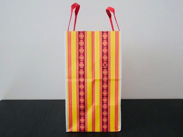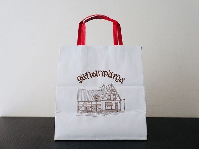 グーチョキパン屋の手提げ袋は、S(110円)、M(300円)、L(350円)の全3種類。サイズごとに持ち手の色が異なります。(写真はSサイズ)