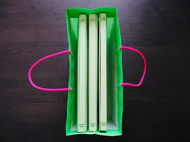 Mサイズの手提げ袋は、A4サイズの書類がすっぽり収まる大きさ。落ち着いたグリーンとピンクの配色が、どこか高級感を漂わせています。