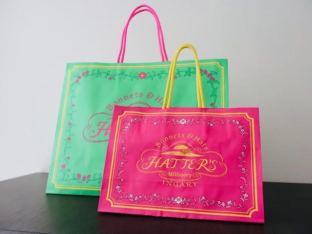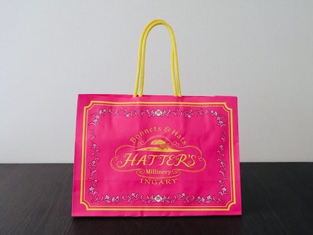 ハッター帽子店の手提げ袋は、SS(100円)とM(200円)の全2種類。落ち着いた雰囲気のデザインが特徴で、2つ並べて飾るとまるでインテリアの一部のよう。デザイン性が高く、ハッター帽子店のクラシックな雰囲気をそのまま再現しています。