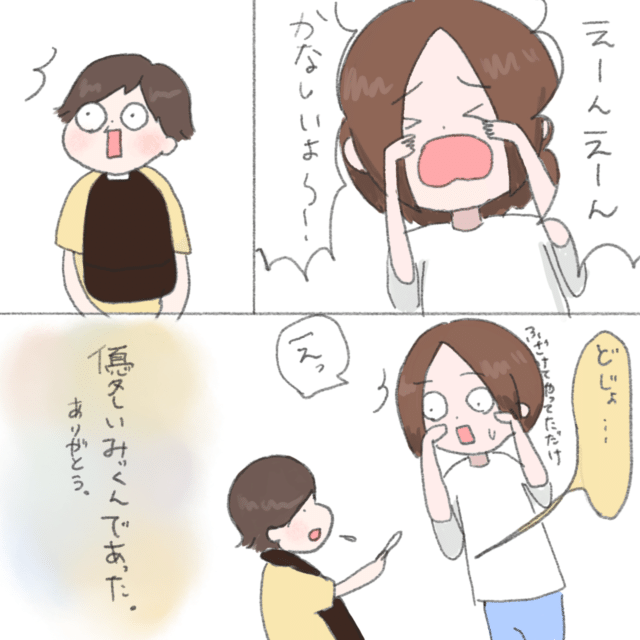 3. 優しくされてちょっぴり罪悪感。息子に拒否され思わず泣き真似した母|ねむりひつじの子育て絵日記
