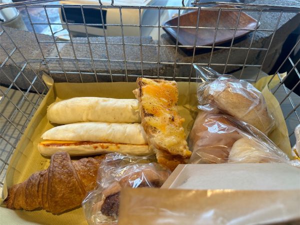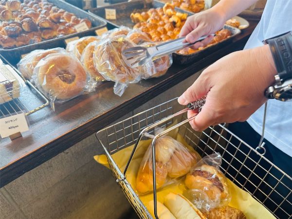 かごを手にもって、気になるパンをどんどん入れていきます。 セルフトレーがかごタイプだとパンを落とすことがないので子ども連れでも安心。