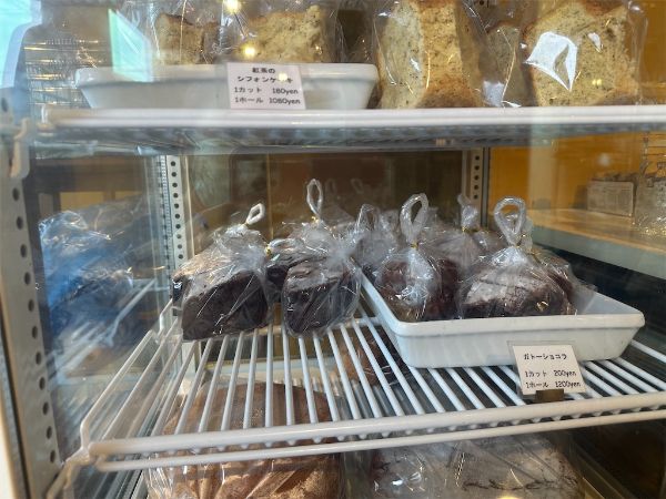 冷蔵庫に入っているガトーショコラは1カットから購入でき、ホールでの販売もあります。