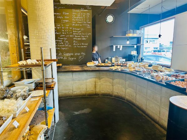 大きな黒板が目を引くおしゃれな店内。たくさんの種類のパンが並んでいます。