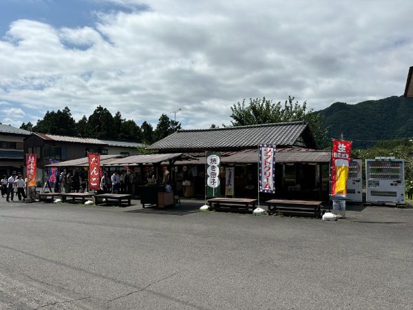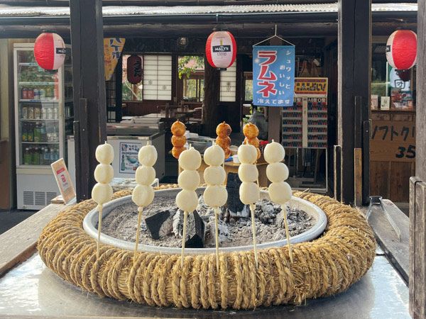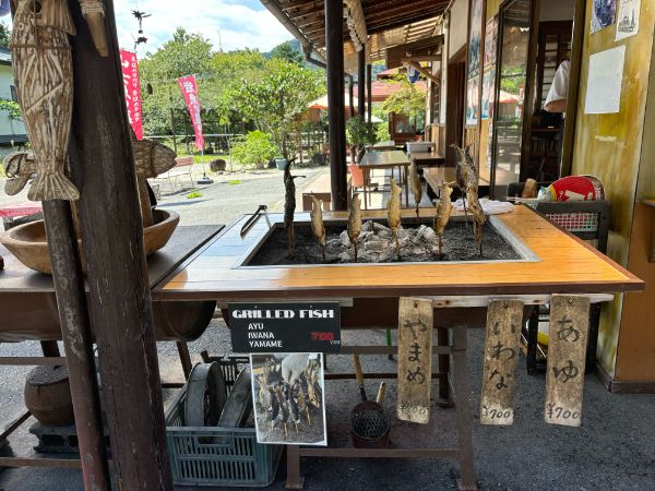 焼き魚も充実しており、川魚の「あゆ」「いわな」「やまめ」の3種類が提供されています。店先では炭火で焼かれている姿が目を引き、つい立ち寄りたくなりますね。3種類の魚を味わうことができるのは珍しいのではないでしょうか。