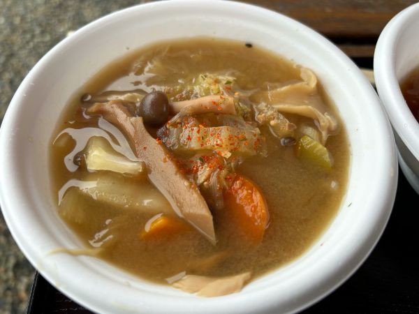 少し肌寒くなってきた季節にぴったりのもう一品が「きのこ汁(400円)」。訪れた日は、まいたけなどのきのこを中心に、たっぷりの野菜が入っていて大満足の内容でした。風味豊かなきのこや野菜の甘みが、味噌ベースの汁とよく絡んで、体の芯からじんわりと温まる美味しさ。まさに秋の訪れを感じる一品です。