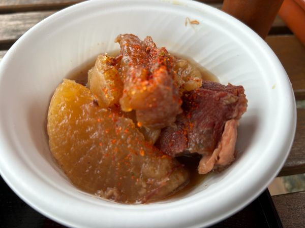 特に秋に食べたくなるのは「牛すじの煮込み(800円)」です。夏の間は痛みやすいことから提供されておらず、涼しくなった季節だけの特別メニュー。持ち帰りもできます。お店の方によると、遠方からわざわざ訪れるファンもいるほどの人気料理だとか。じっくり煮込まれた牛すじは驚くほど柔らかく、とろけるような食感でした。しっかりと染み込んだ味わいが心までとけていく(笑)。お好みで七味唐辛子をかけると、ピリ辛のアクセントが絶妙にマッチして、さらに美味しくいただけます。