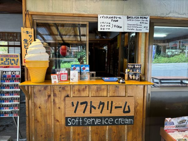 スイーツ好きには見逃せないのが、ソフトクリーム。定番のいちご・抹茶・チョコレートに加え、「山椒味噌ソース」があります。