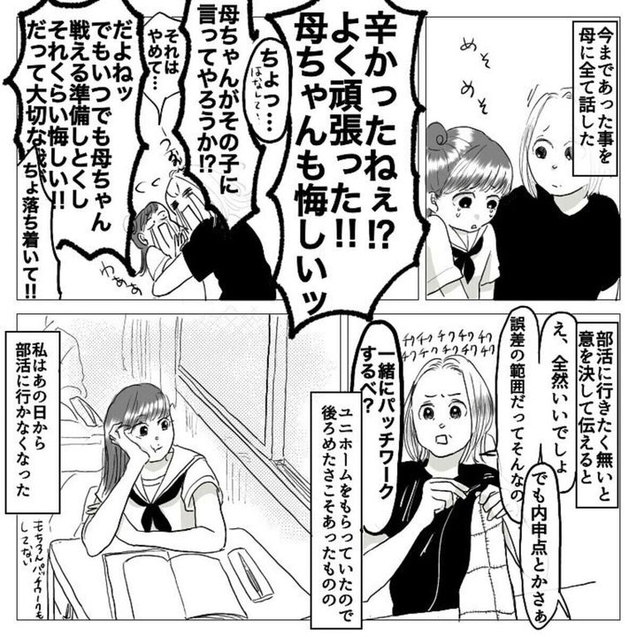 もし、わが子がいじめに遭ったらどうしますか?とても心配ですよね。家での様子もいつもと違っていたり、落ち込んだりしている姿は、誰でも見たくはないでしょう…。今回ご紹介するお話は、芸子(@geiko_tumu)さんの中学生時代を描いた漫画です。友人関係、部活、そしていじめ…。読んでいると、当時の記憶が呼び起こされる方もいるでしょう。そんな、『思い出小話』をダイジェストでご紹介します。どうぞごらんください。