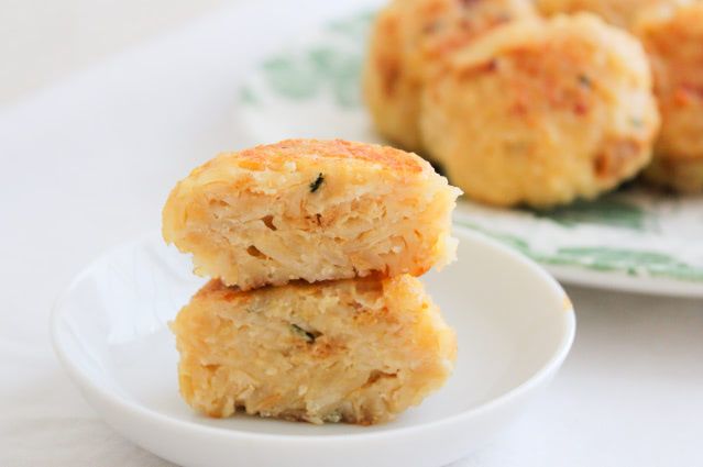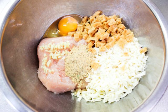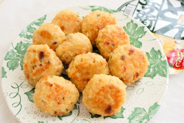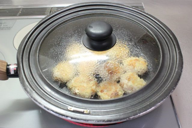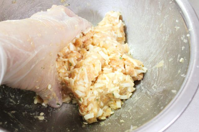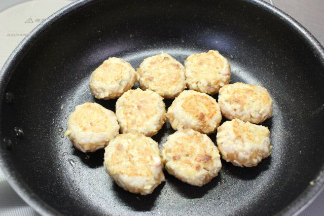 うどんの麺が硬いのでひき肉の中にコリッとした手ごたえが。水分は卵1個分なので少し硬めの肉だねに感じます。今回は10個に丸めました。