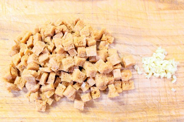 1. うどんを袋に入れて麺棒などで叩いて細かく砕き、おあげを刻みます。