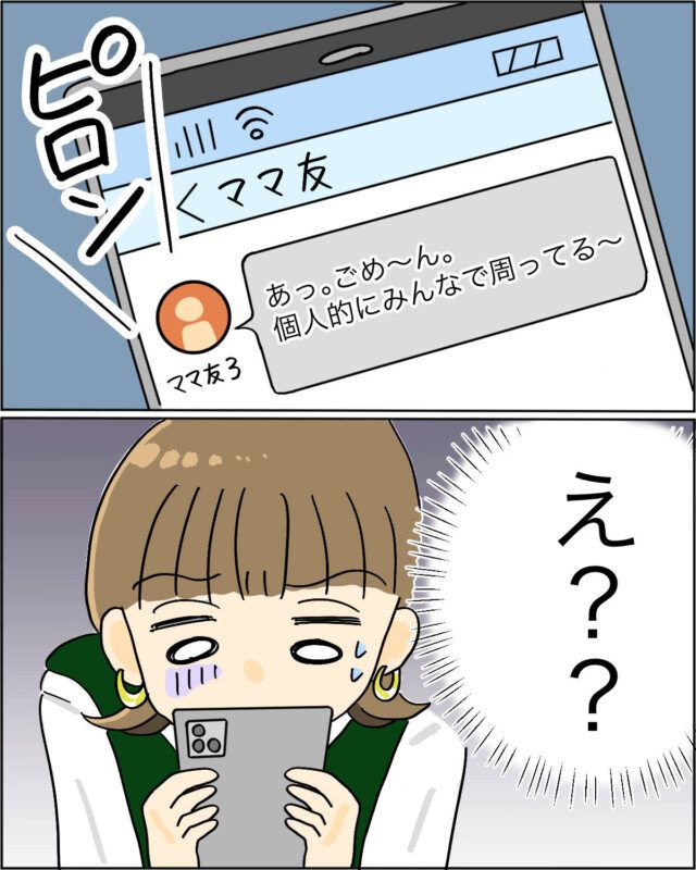 ハロウィンの仮装の話を聞いていなかったママさんが慌ててママ友のグループチャットに書き込んで聞いてみると、ほとんどのママたちが「知らない」という中、一人のママ友さんから「あっ。ごめ~ん。個人的にみんなで周ってる~」と返事がきました。
