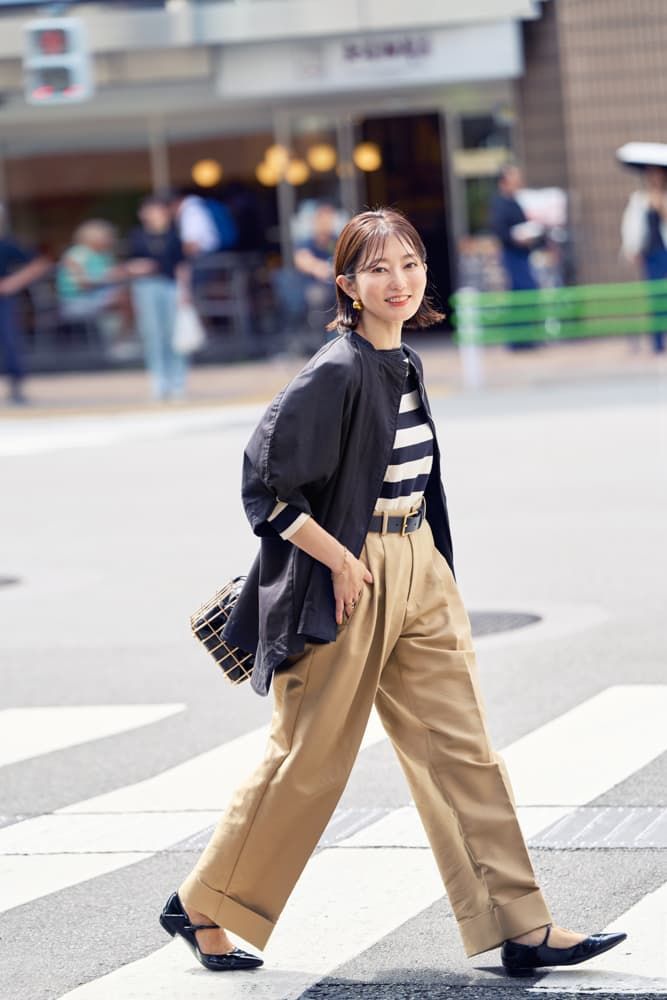 秋も本番、心地よい気候になったら、ブルゾンの袖のボタンを閉めてふんわり膨らませて、中に着たボーダーとのレイヤードを楽しみます。ザンゲッティのマーケットバッグはコーデのスパイスに。中に入れる巾着をいろいろな素材の手持ちのものに入れ替えて、季節感を出しています。
