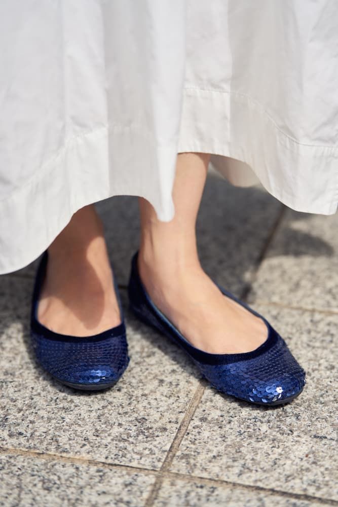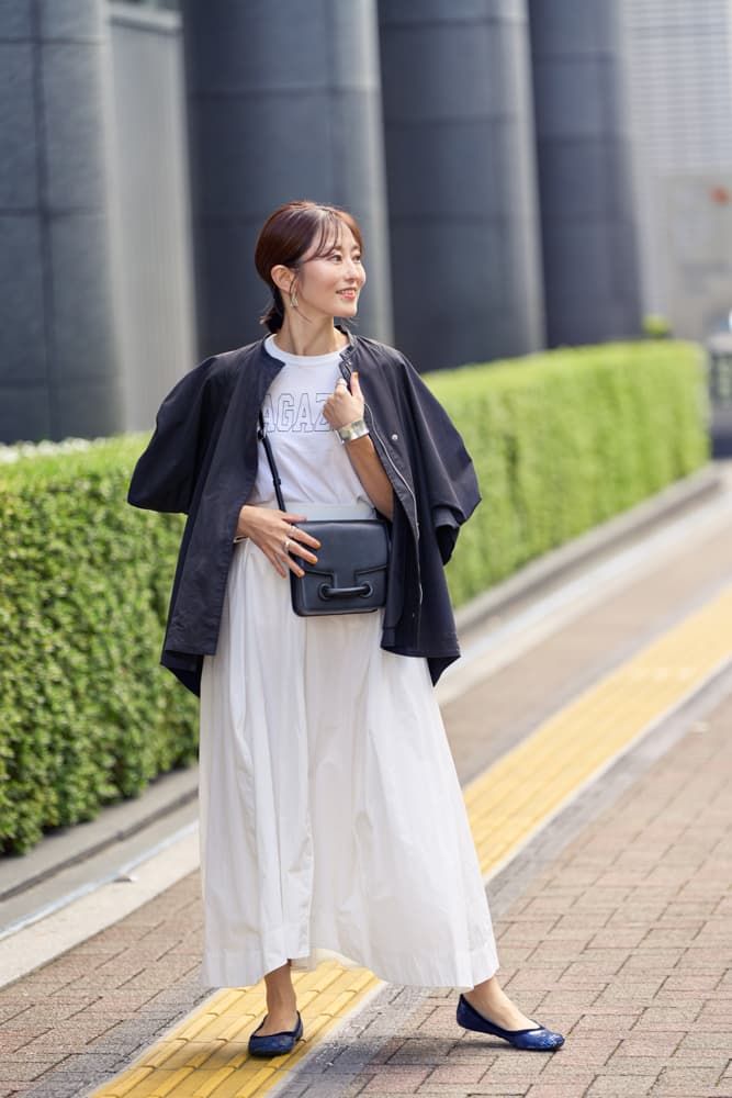 秋の始まりってまだ蒸し暑い日もあるので、温度調節しやすい秋ハオリが欠かせません。Tシャツとスカートは白で爽やかに、ハオリとバッグを黒にして引き締めました。コーデがシンプルなので、足元にはスパンコールのぺたんこパンプスを合わせてアクセントを!