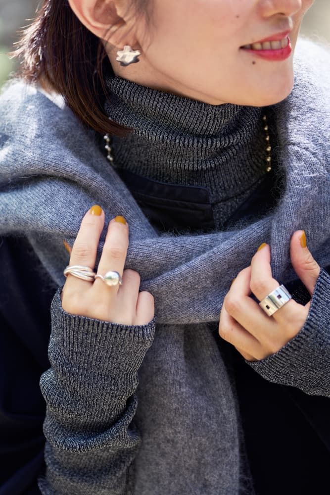 この頃は暖冬なので冬の始めにはまだ軽めのアウターにレイヤードで十分暖かい。インナーのラメニットと、マフラーのように肩掛けしたふわふわニット、それにシルバージュエリーをグレーで統一。素材違いのグラデーションになりコーデに奥行きが出ます。