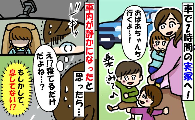 「寝ているだけよね…?」帰省中ふと静かになった車内「え!?」2歳の次女のとんでもない姿に顔面蒼白