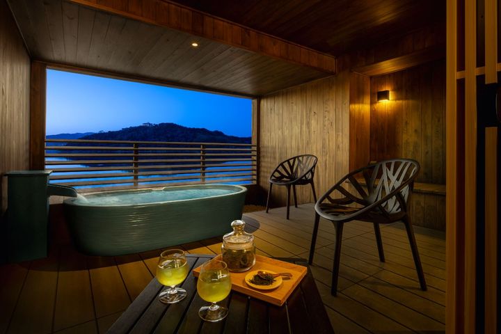 全室から浜名湖の眺望を楽しめ、至る所にお茶のおもてなしが用意された温泉旅館です。滞在シーンに合わせて楽しむ茶葉とお茶を入れる設備の整った客室、お茶玉を使った入浴など、日本一のお茶処にちなんだお茶にまつわるおもてなしが随所にちりばめられています。