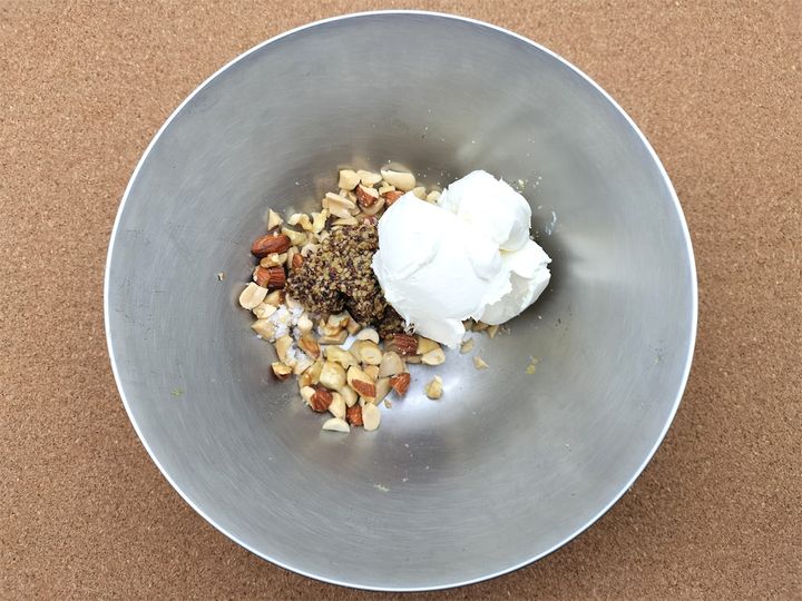 2. 別のボウルにクリームチーズ、くるみやナッツ、粒マスタード、塩を入れて混ぜ合わせます。