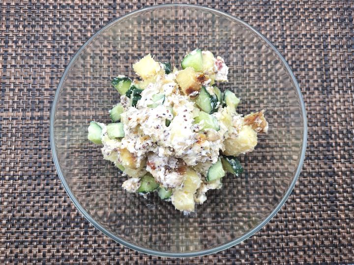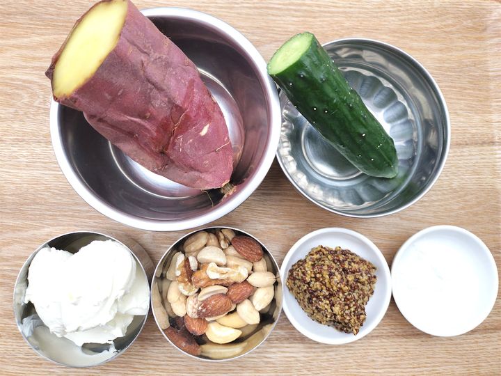 材料を用意しながら、「不思議な組み合わせだなぁ」と思いましたが、いざ出来上がってみると驚きのおいしさでした。柔らかい焼き芋とクリームチーズ、歯ごたえのあるきゅうりとくるみやナッツ、それが粒マスタードと塩と合わさって、食べたことのないおいしいポテサラが出来上がりました。食感を楽しめるのはもちろんのこと、焼き芋の甘み、クリームチーズのコク、きゅうり独特の青みのある味、ナッツの香ばしさ、粒マスタードの酸味と軽い辛みがひとつになっているのには本当にびっくりです。