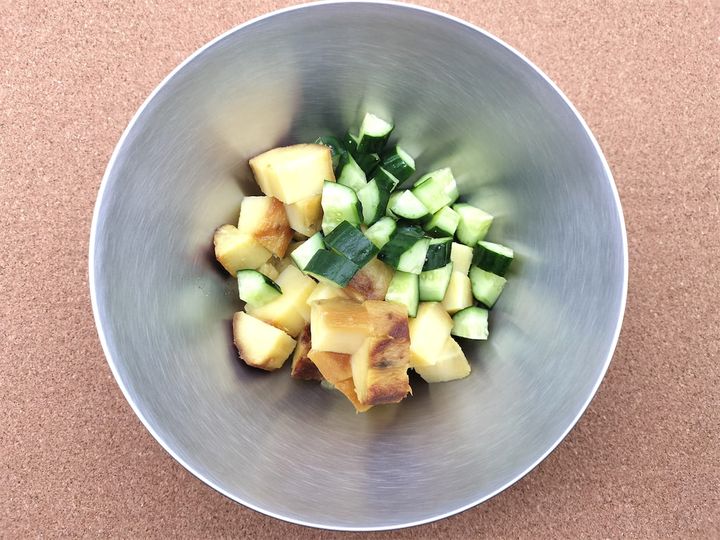 1. 焼き芋ときゅうりをボウルに入れて、合わせておきます。