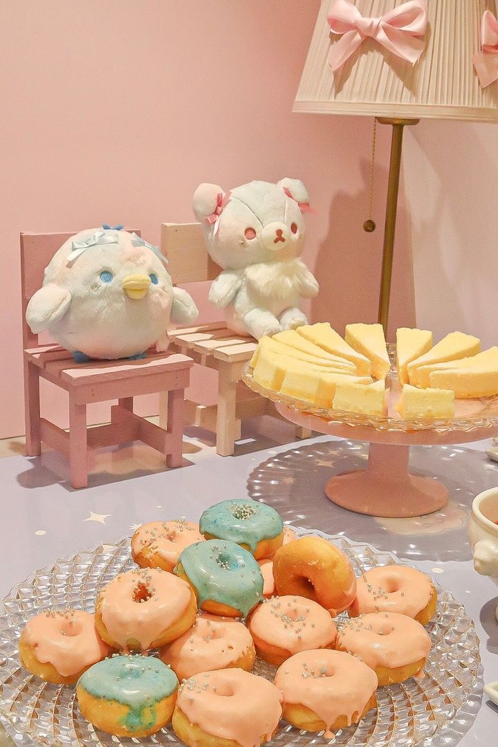 淡いピンクと水色の「ペガサスとユニコーンのミニドーナツ」やタルトは見て可愛い、食べて美味しくとてもオススメ!他にもリラックマが描かれたマカロンや夜空と星をイメージされたケーキ、空と雲をイメージしたゼリーなどが並び気付けば全種類手を伸ばしていました笑