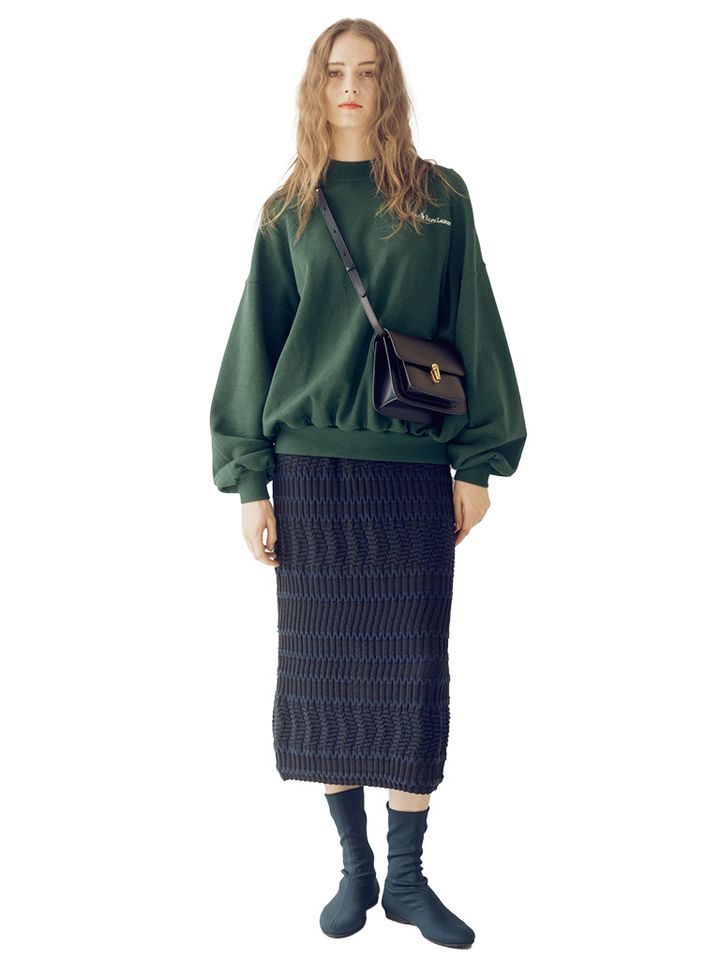 【POINT】ニットスカートはひざ丈でもロングでもない中途半端なミモレ丈。キレイなイメージのグリーンとネイビーをゆるく組み合わせることで、肩に力の入らない「インテリ&ルーズ」スタイルを構築。