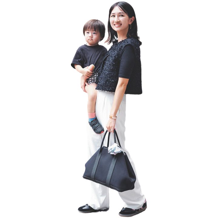 「前開きで授乳もOK、一枚でもTシャツレイヤードでも決まる救世主!」秋本陽菜さん(1歳男の子ママ)ニットベスト¥27,500(ロエフ/H BEAUTY&YOUTH)