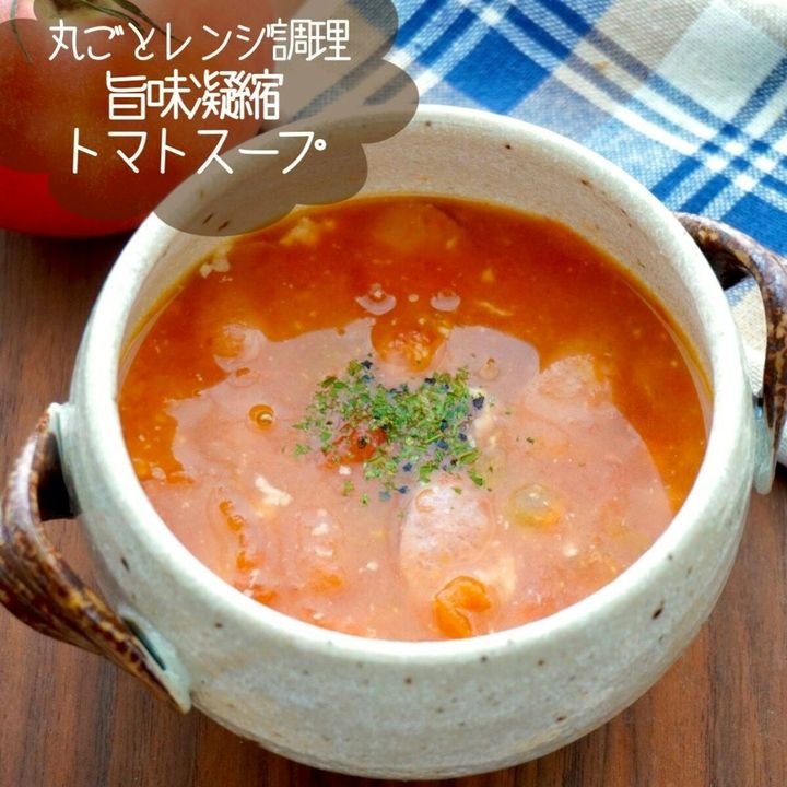 トマトのうま味がぎゅっと詰まった絶品トマトスープ。丸ごとレンジで加熱して作るので洗い物も最小限です。