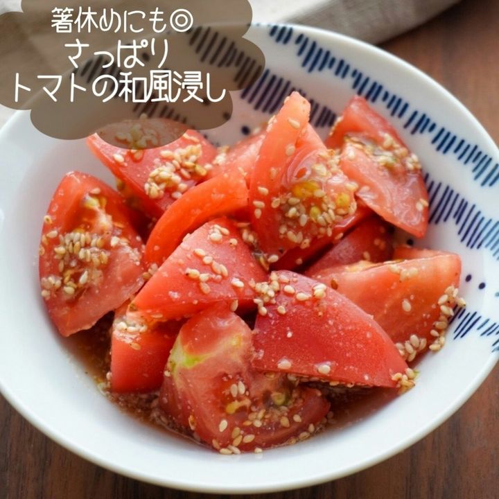 めんつゆを使ったトマトの和風浸し。調味料を和えるだけで完成するので、5分ほどで作ることができます。