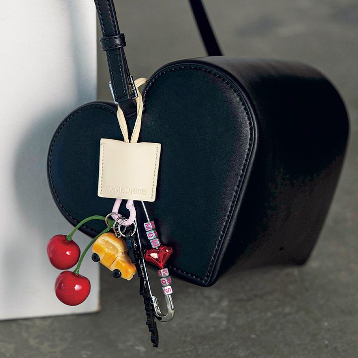 「TAMBURINS」のイベントでカスタマイズしたチャームを、VASICのハートバッグに。娘の好きなさくらんぼ、娘のイニシャルを入れた安全ピン、韓国で人気の車の形のパンなど。可愛いチャームはだいたい娘に取られてしまうけど、これは「つけているとお仕事中も一緒にいられる気分になれるからママにつけさせてね」と言ったら納得してくれました(笑)。