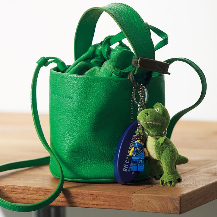 3年選手のthehighlightsのバケツバッグは軽くて綺麗なグリーンがコーデのポイントになって使い勝手抜群!息子の好きなキャラクターとRon Hermanのチャームはブルーとグリーンの2色に絞って統一感を。miumiuのブレスをミックスして大人のバランスに。