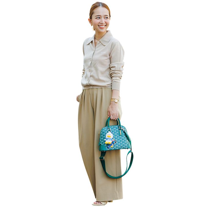 サンリオのキャラクターチャームをじゃらづけする海外スナップを見たのがきっかけで、サンリオ好きとしてはたまらず、すぐに真似っこ(笑)。ベージュのワントーンに、あひるのペックルとペッツのチャームをつけたゴヤールのバッグで色を効かせます。