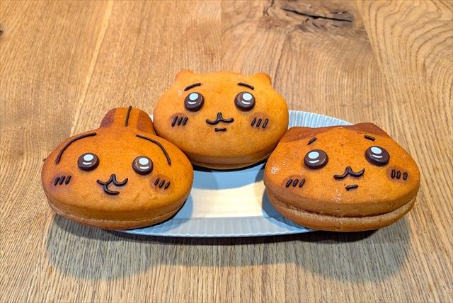 カスタード(ちいかわ)、チョコレート(ハチワレ)、キャラメル(うさぎ)のクリームがギュギュっと入ったパン。つぶらな瞳など、キャラクターの表情がしっかりと再現されています。