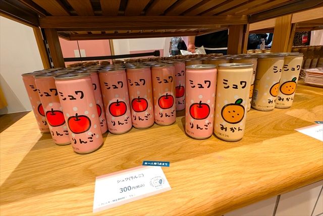 作中に登場するドリンク「シュワ」を再現したドリンク。味はみかんとりんごの2種類で、ゆるーいイラストがポイント!