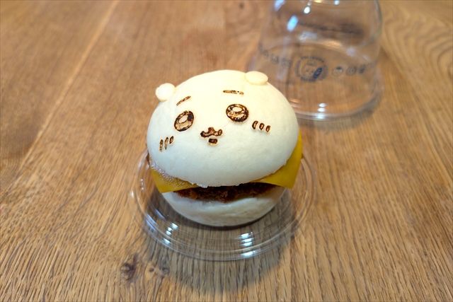 「ちいかわコロッケバーガー」は、ちいかわのまっ白なバンズに、牛肉コロッケとチェダーチーズをサンド。こぶし大の大きさですが、濃厚なチーズとボリューミーなコロッケ、パンチのある味付けで食べ応えは十分!