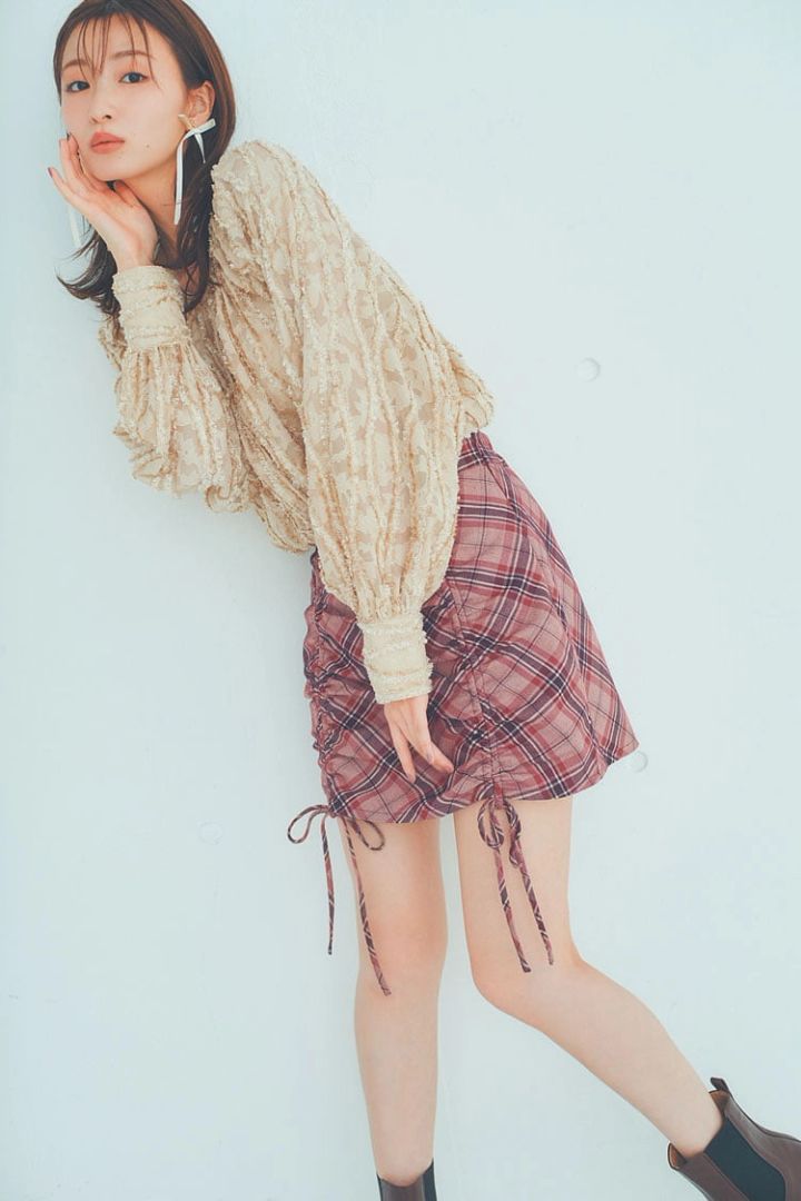 ベージュブラウス 5,500円/archives チェックスカート 5,500円/ OLIVE des OLIVE イヤリング 330円/ラティス ショートブーツ 14,850円/ラウナレア(uf.)