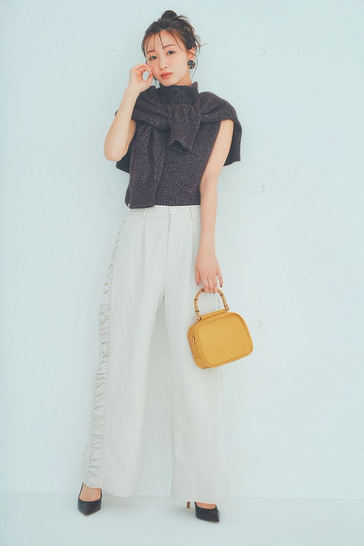 ノースリタートルニット 11,000円、ニットカーディガン 14,300円/ともにNoela サイドフリルパンツ 6,930円/archives バッグ 4,950円/ACCOMMODE ルミネエスト新宿店 イヤリング 5,940円/アビステ パンプス 17,600円/ダイアナ(ダイアナ 銀座本店)