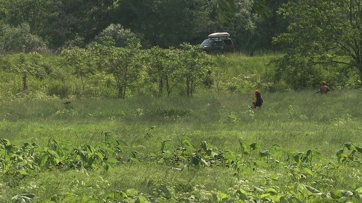山のほう、発砲可のエリアに入ったクマ。ハンターらが駆け寄ります。