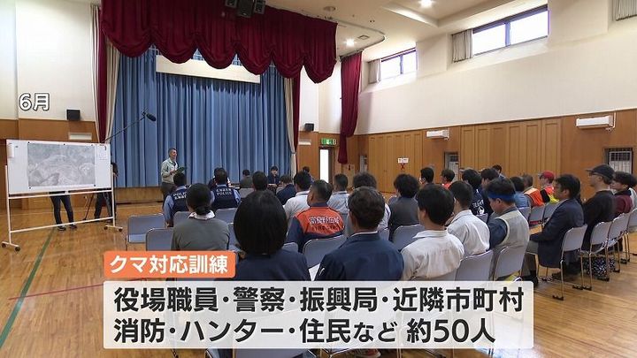 6月に行ったクマ出没対応訓練には、役場職員や警察、振興局、近隣市町村、消防やハンター、住民など50人ほどが集まりました。
