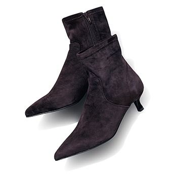 スエードポインテッドトゥブーツ(4.5)/LOUNIE しなやかなスエード素材でシルエットの鋭さを緩和。質感に表情があるから、暗い色みで選んでものっぺり見えないよさがある。