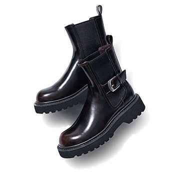 サイドゴアブーツ(4.5)/CHARLES & KEITH(CHARLES & KEITH JAPAN) ベルトつきの無骨なサイドゴアブーツを黒にほど近いブラウンで選択。ワーク感と洒落感をいいとこどりでき、黒のフレアスカートなど女性らしいボトムともマッチ。