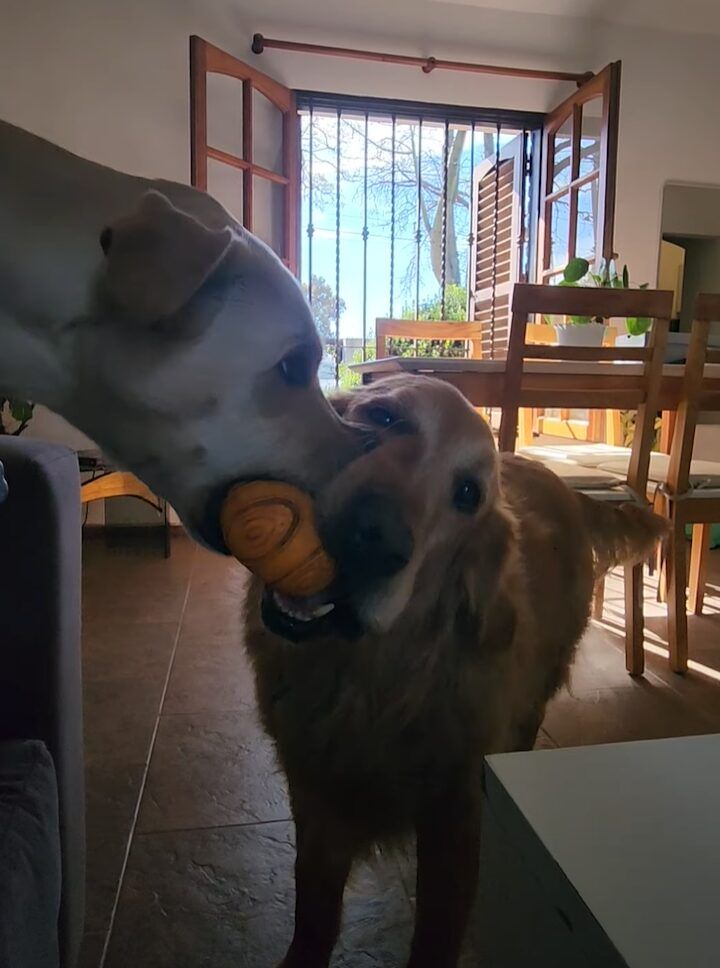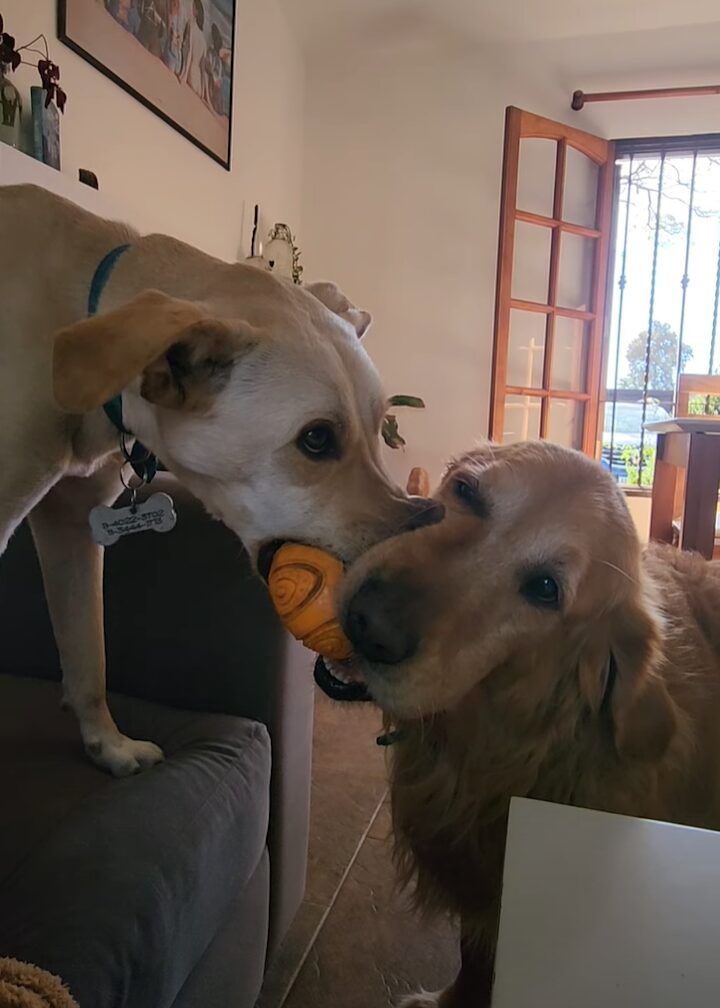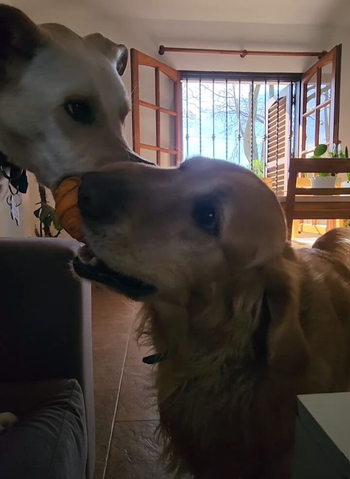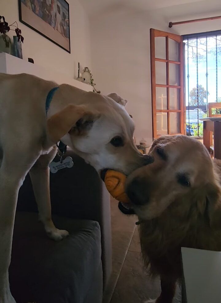 カメラには、このお宅の愛犬たちの姿が。 この子たちは、1つのボールをくわえいます。
