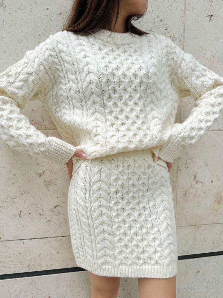 「可愛らしいニットセットアップを大人っぽくカジュアルに♡ アランケーブル柄がレトロで可愛いニットのスカートとセットアップになっています。ボリュームがあって女性らしいニットなので、甘くなりすぎないようあえてスニーカーではずしました」
