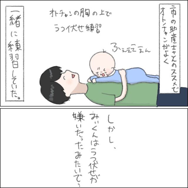 しばらく目を合わせてくれないからお父さんもショックで、その後しばらくうつ伏せ練習はしなくなったのでした。